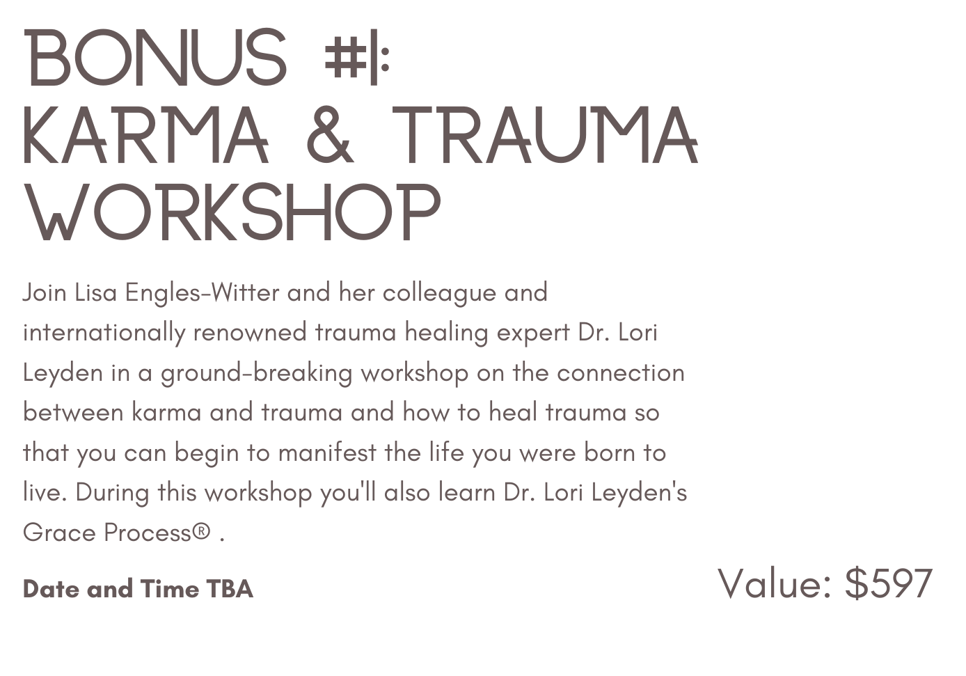 You'll also receive the Karma & Trauma workshop (live), guided audio meditations, written practice guides, transcripts and lifetime access to everything.